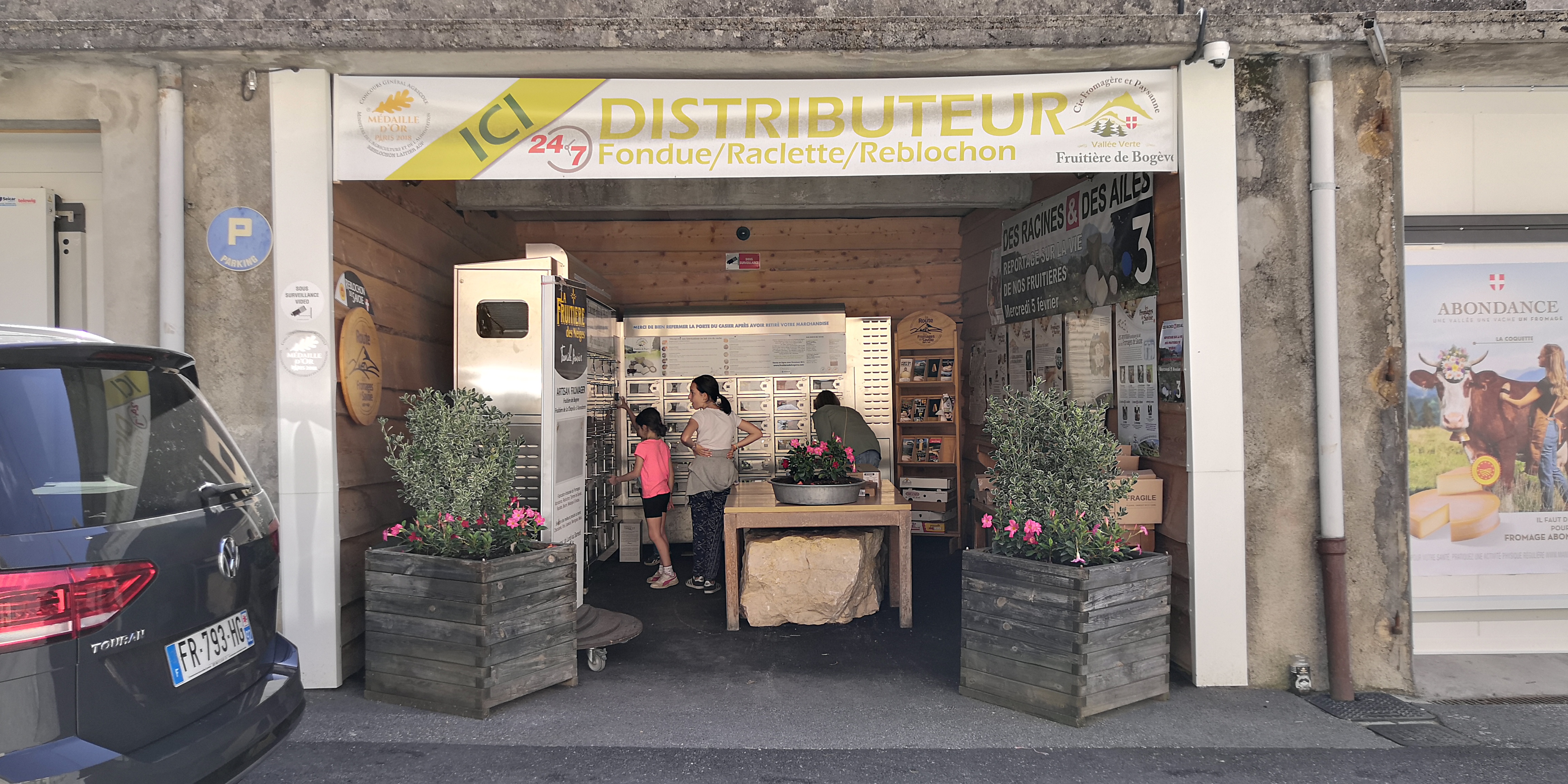 Exceptionnel : ici on peut acheter 24h/24 et 7j/7 fromages (dont raclette), yaourts et charcuterie grâce à des petits casiers réfrigérés contenant chacun un assortiment différent (de 15 à 50+€). Je trouve absolument génial qu'un producteur se lance dans un outil aussi innovant. Il y a beaucoup de choix, on paie par CB et la (ou les) porte s'ouvre. Bravo pour cette innovation et longue vie à votre concept !